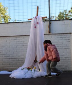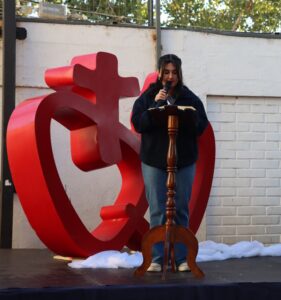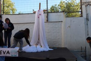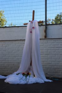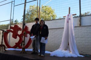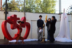 A continuación, se hizo un signo de Pascua, una profesora ingresó con el cirio pascual, el que nos recuerda que Cristo vive y está presente en nosotros iluminando nuestro caminar cada día en el colegio. Cuatro estudiantes presentaron cuatro palabras que queremos que crezcan en nuestra comunidad: esperanza, alegría, perdón y vida nueva. También, ingresaron estudiantes con flores que pusieron a los pies de la cruz como signo de vida, alegría y esperanza.