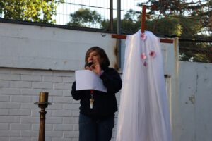 Tras la lectura del Evangelio, Trinidad Poblete, Encargada de Pastoral, reflexionó sobre la Resurrección de Jesús diciéndonos que “queremos que este Jesús resucitado se quede en nosotros. En cada gesto de bondad, perdón que hagamos él está presente. La Pascua de Resurrección nos trae el desafío de hacer presente a Jesús en nuestra comunidad. La invitación es a construir un comunidad más fraterna”.
