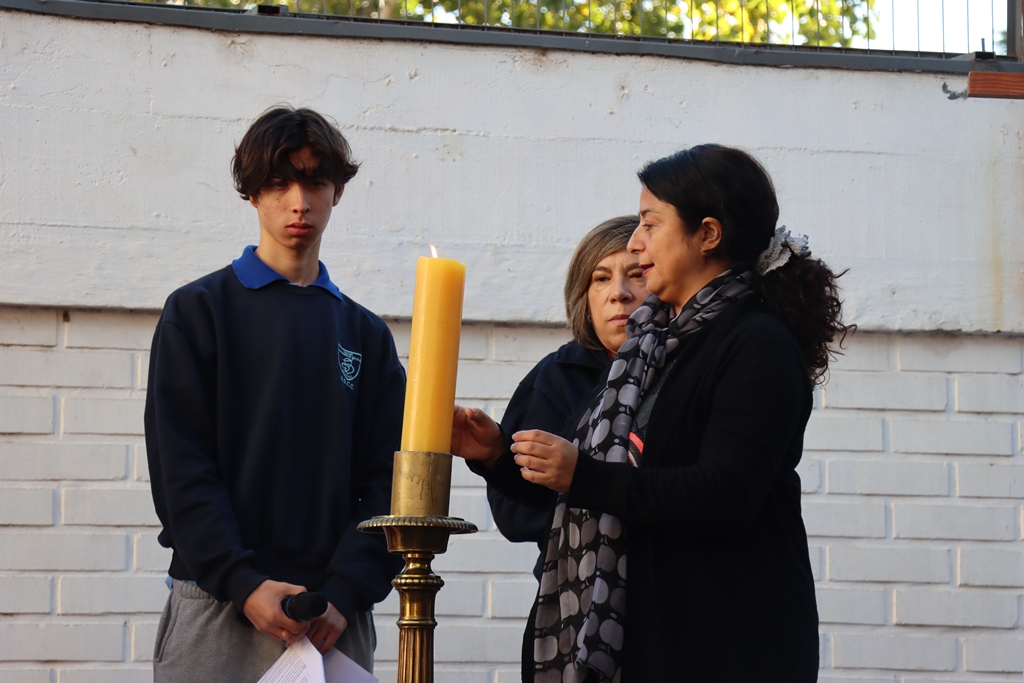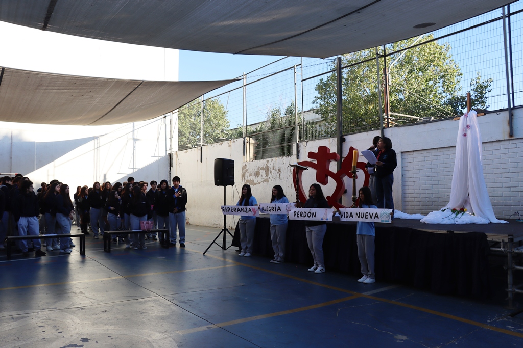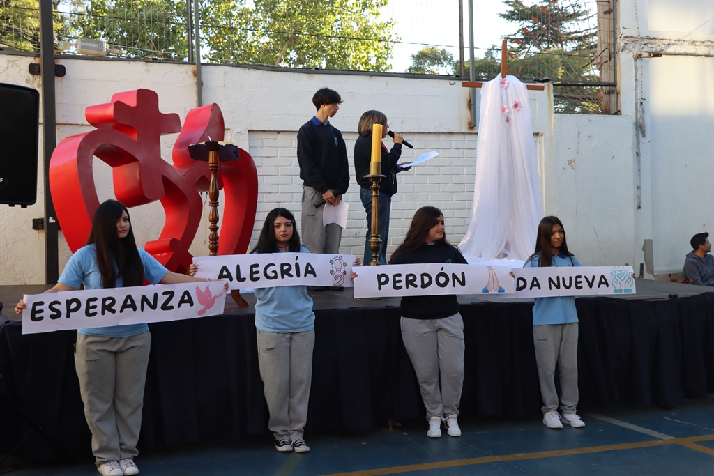 A continuación, se hizo un signo de Pascua, una profesora ingresó con el cirio pascual, el que nos recuerda que Cristo vive y está presente en nosotros iluminando nuestro caminar cada día en el colegio. Cuatro estudiantes presentaron cuatro palabras que queremos que crezcan en nuestra comunidad: esperanza, alegría, perdón y vida nueva. También, ingresaron estudiantes con flores que pusieron a los pies de la cruz como signo de vida, alegría y esperanza.