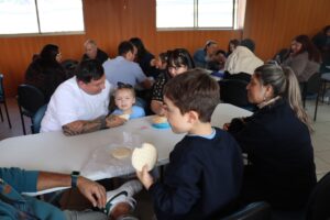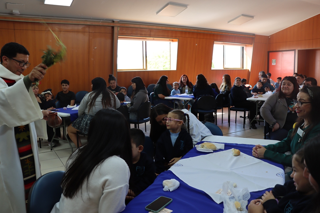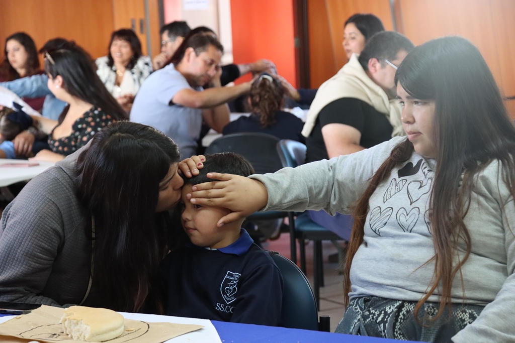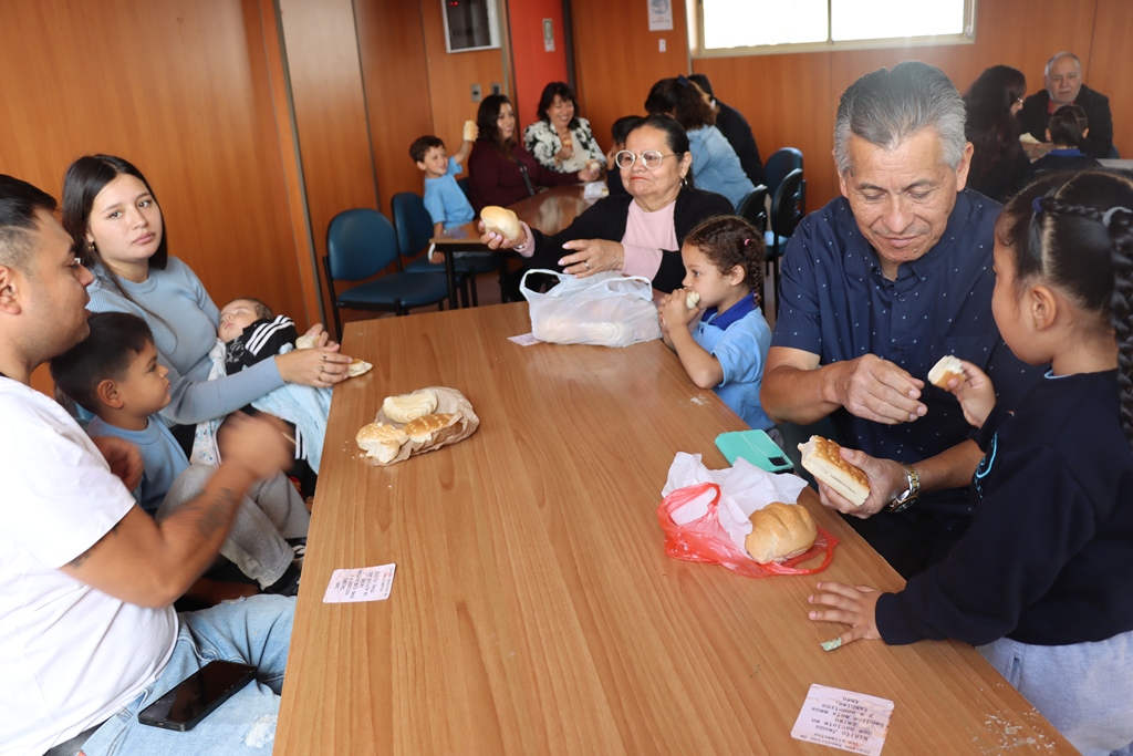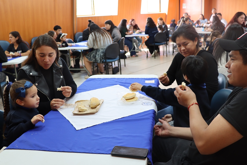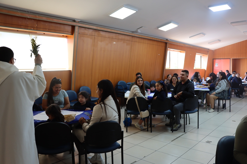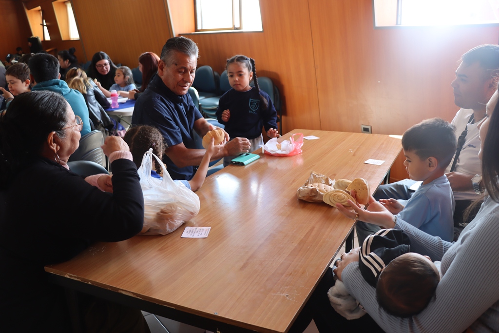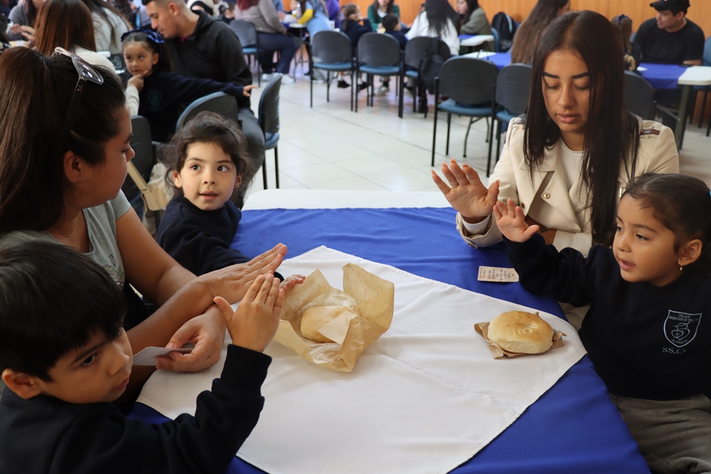 Cada mamá, papá, abuela, tía que acompañó a un niño y niña de Pre Kínder, después de la bendición del pan, lo repartió diciéndole qué le deseaba; luego le hicieron la señal de la cruz en la frente. Se les entregó una oración para el momento de bendecir los alimentos y se les invitó a rezarla en sus hogares.