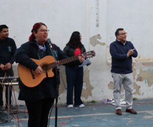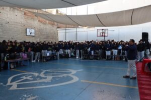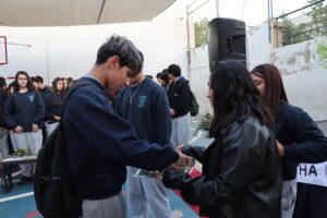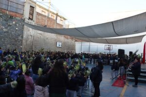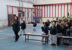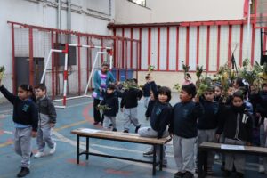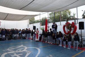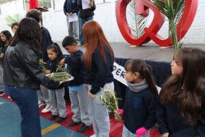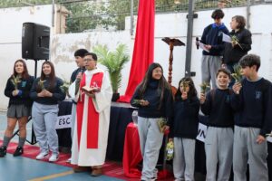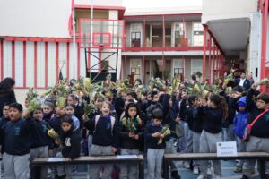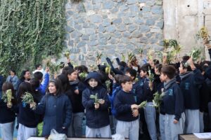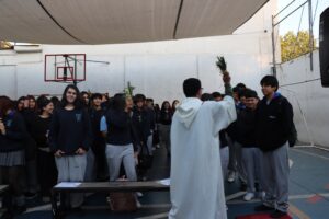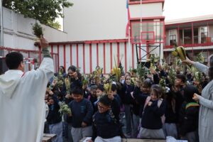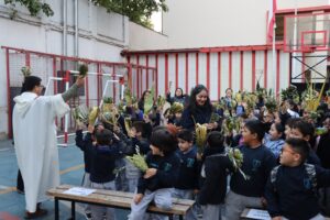 Esta mañana, nos reunimos como comunidad para recordar lo que celebramos ayer en el Domingo de Ramos cuando Jesús entró a Jerusalén y la gente lo recibió con alegría. Como en ese mismo día, los y las estudiantes levantaron sus ramos mientras el padre Rodrigo ingresó en compañía de los niños y niñas de Kínder, los más pequeños de la jornada.