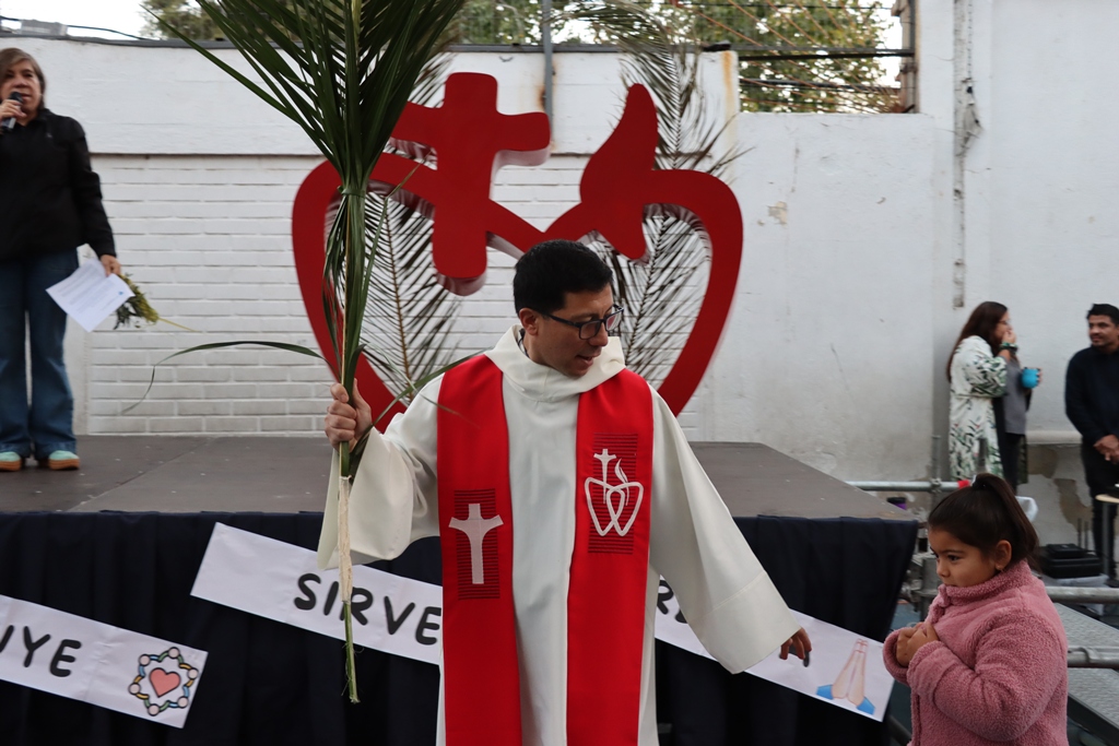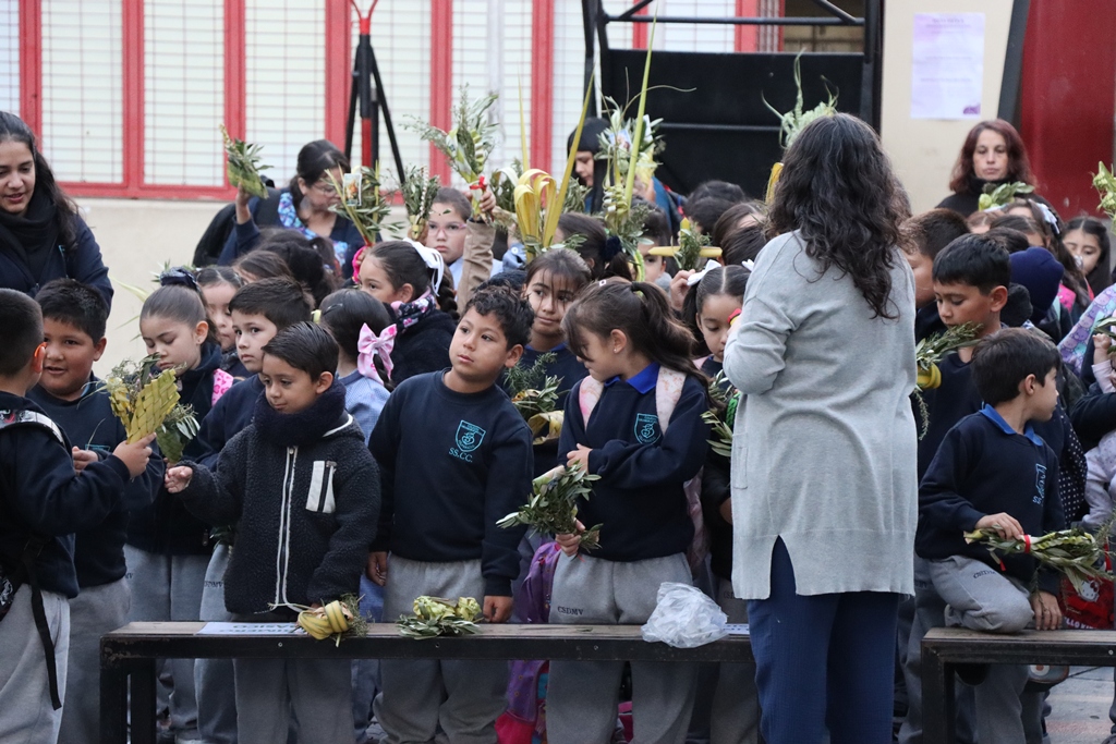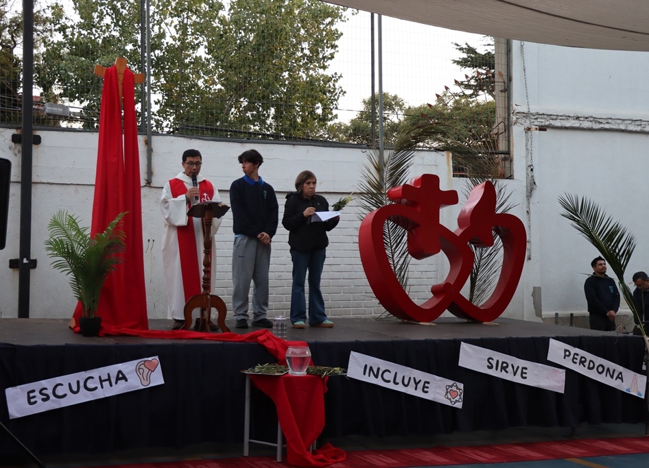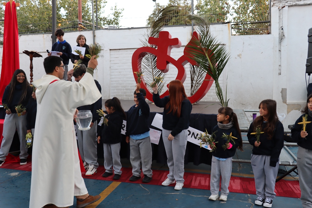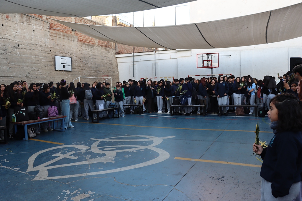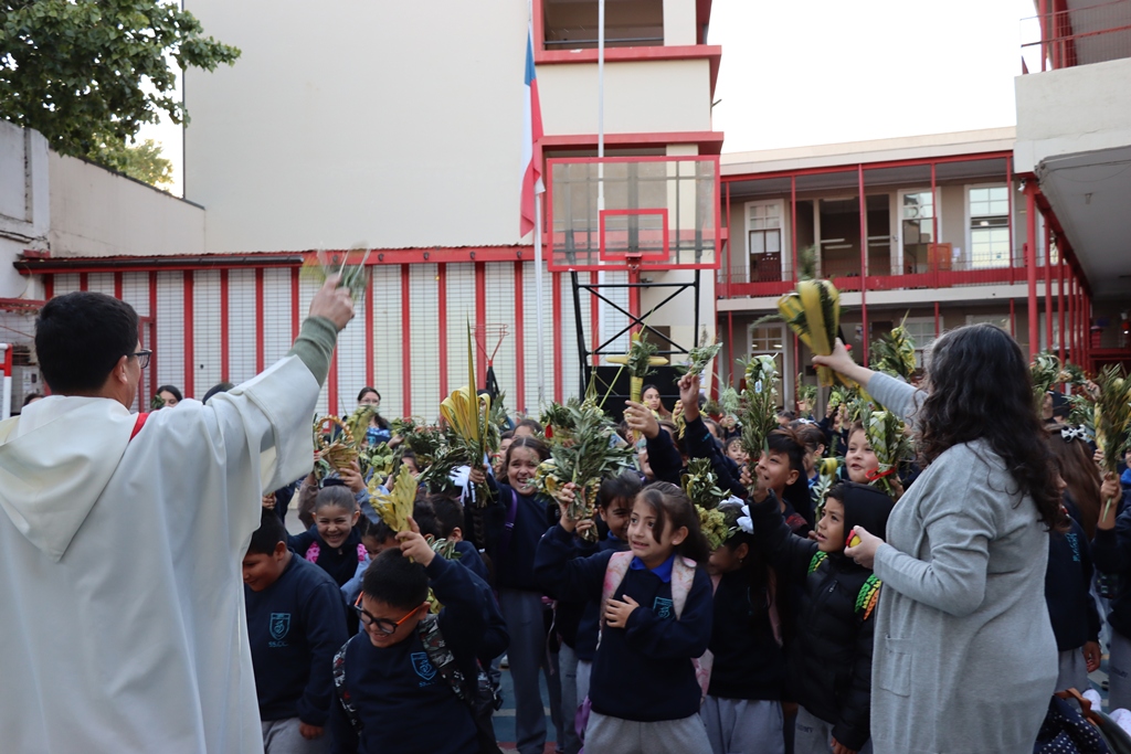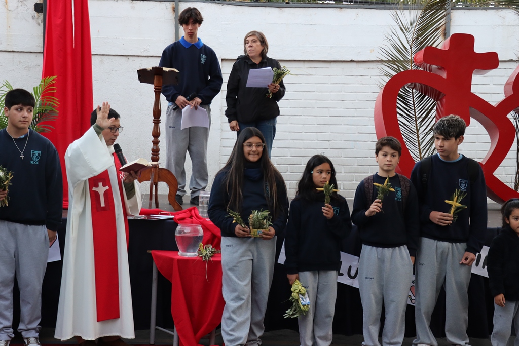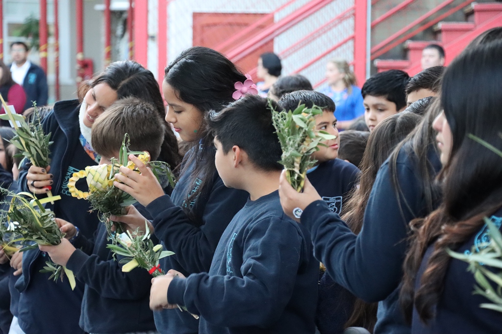 Esta mañana, nos reunimos como comunidad para recordar lo que celebramos ayer en el Domingo de Ramos cuando Jesús entró a Jerusalén y la gente lo recibió con alegría. Como en ese mismo día, los y las estudiantes levantaron sus ramos mientras el padre Rodrigo ingresó en compañía de los niños y niñas de Kínder, los más pequeños de la jornada.