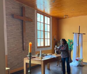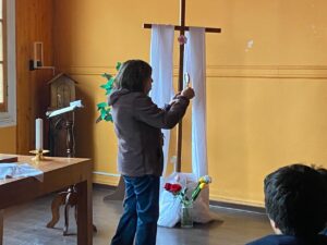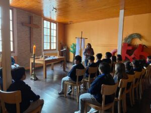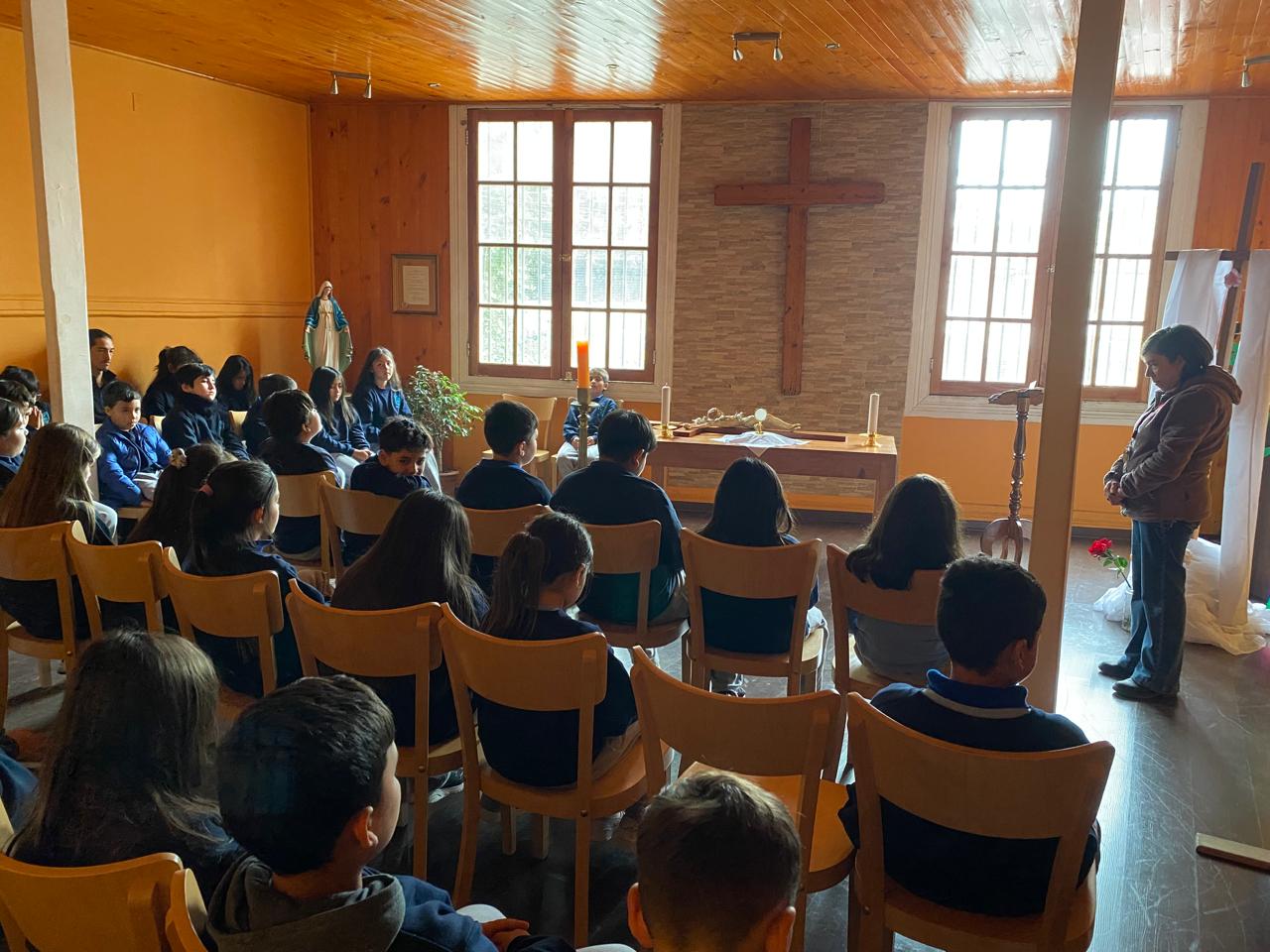 El viernes 10 de abril, niños y niñas de 4° básico vivieron una hermosa experiencia de oración en la capilla de nuestro Colegio. En un primer momento, Trinidad Poblete, encargada de Pastoral, les explicó qué era una Adoración. Luego, expuso el Santísimo Sacramento y le señaló a los estudiantes que conversaran con Jesús.