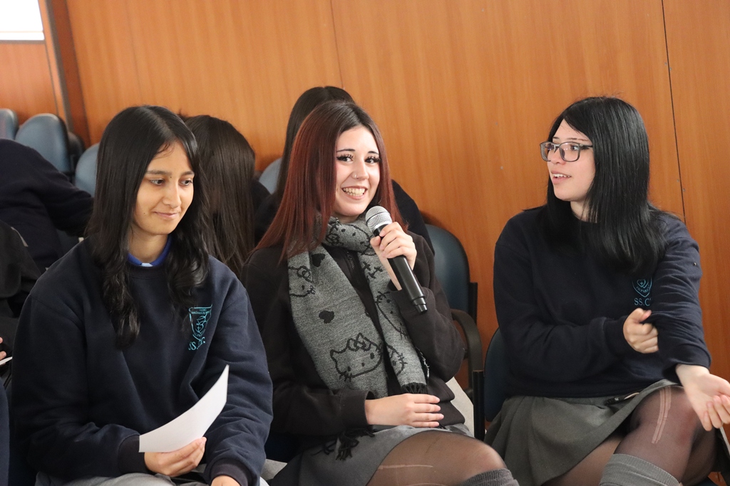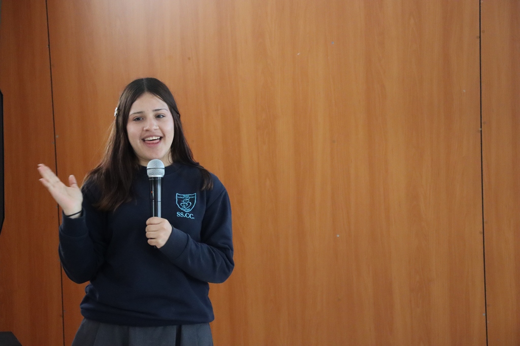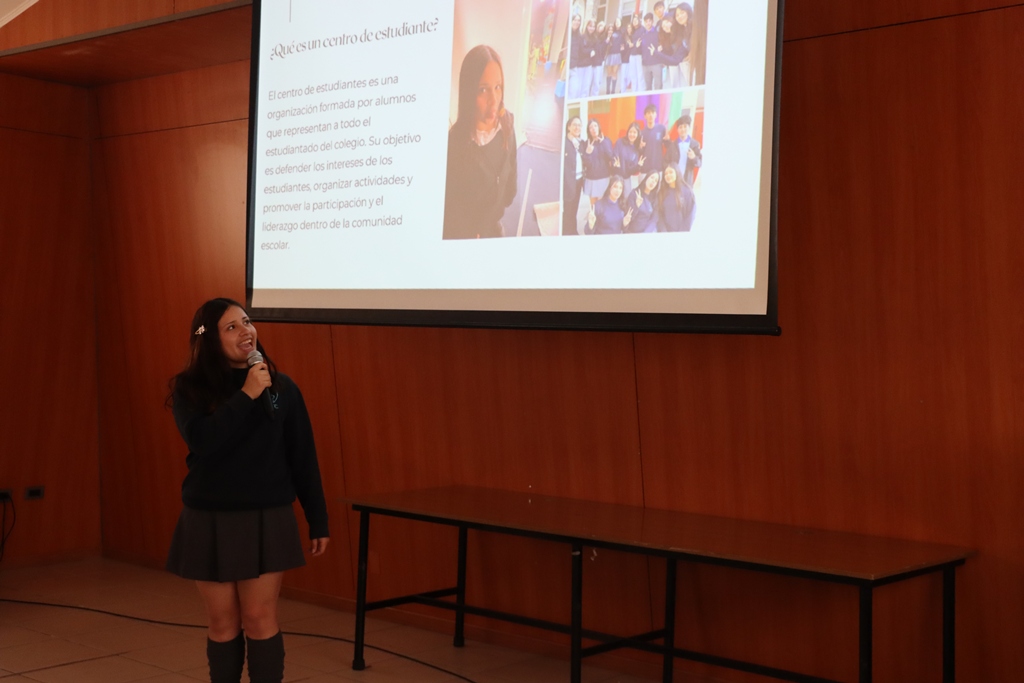 La Presidenta del CEE, Shiro Gallardo, les habló de su experiencia como Presidenta en el Centro de Estudiantes, las diversas actividades que han realizado en nuestro colegio y los encuentros que le ha tocado participar y mostrar su liderazgo como; Congreso Juvenil SS.CC., Un viaje por la cultura y la fe chilota, y la Confraternidad Cultural.